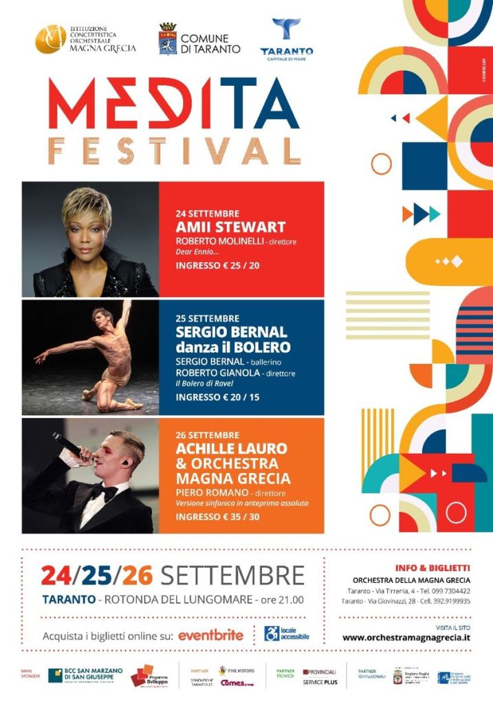 Grande attesa per la “tre giorni” del “MediTa, Festival della Cultura mediterranea” in programma sulla Rotonda del Lungomare a cura del Comune e dell’Orchestra della Magna Grecia, per chiudere in bellezza l’estate tarantina. Il “via” alla rassegna sarà per giovedì 24 settembre alle 21 con Amii Stewart in “Dear Ennio!”, dirige il maestro Roberto Molinelli, (ingresso 25, 20 euro); venerdì 25 settembre alle 21, Sergio Bernal danzerà sule note del “Bolero” di Ravel, dirige il maestro Roberto Gianòla (ingresso 20, 15 euro); sabato 26 settembre alle 21, Achille Lauro & Orchestra della Magna Grecia, versione sinfonica dei successi del cantautore in anteprima assoluta, dirige il maestro Piero Romano,(ingresso 35, 30 euro). Previsti abbonamenti per assistere ai tre spettacoli : 65euro primo settore, 55euro secondo settore. Per il concerto di Achille Lauro, i possessori dei biglietti acquistati per la serata al teatro Orfeo, poi rinviata causa Covid-19, potranno contattare gli uffici dell’Orchestra Magna Grecia per informazioni sul nuovo posto in via di assegnazione o su eventuali rimborsi.Biglietti e info (www.orchestramagnagrecia.it): Orchestra della Magna Grecia, via Tirrenia 4 (099.7304422) e via Giovinazzi 28 (392.9199935). Biglietti e abbonamenti per assistere agli eventi in programma al Medita potranno essere acquistati anche online sulla piattaforma “Eventbrite”.