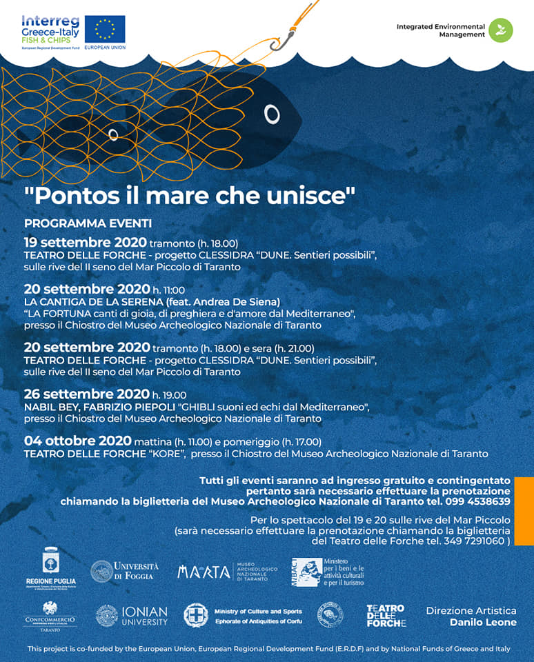 L’Università di Foggia ed il Museo Archeologico Nazionale di Taranto-MArTA organizzano “Pontos. Il mare che unisce”, una rassegna di eventi artistici legati alla cultura del mare, comunità e identità grazie al progetto FISH & C.H.I.P.S (Fisheries and Cultural Heritage, Identity, Participated Societies) – finanziato dal Programma Interreg V/A Grecia – Italia2014/2020, di cui il MArTA è partner progettuale associato.In programma concerti e spettacoli teatrali organizzati in collaborazione con compagnie teatrali (Teatro delle Forche), musicisti e artisti (La Cantiga de la Serena, Nabil Bey e Fabrizio Piepoli). Gli eventi, sotto la direzione artistica del Prof Danilo Leone (Università di Foggia), avranno luogo in Taranto come da calendario: • 19 settembre 2020 tramonto (ore 18:00): TEATRO DELLE FORCHE – Progetto CLESSIDRA “DUNE. Sentieri Possibili”, sulle rive del II seno del Mar Piccolo di Taranto;• 20 settembre 2020 (ore 11:00): La Cantiga de la Serena (feat. Andrea De Siena), “LA FORTUNA canti di gioia, di preghiera e d’amore dal Mediterraneo”, presso il chiostro del MArTA;• 20 settembre 2020 tramonto (ore 18:00) e sera (ore 21:00): TEATRO DELLE FORCHE – Progetto CLESSIDRA “DUNE. Sentieri Possibili”, sulle rive del II seno del Mar Piccolo di Taranto;• 26 settembre 2020 (ore 19:00): Nabil Bey, Fabrizio Piepoli in “GHIBLI suoni ed echi dal Mediterraneo”, presso il chiostro del MArTA;• 04 ottobre 2020 mattina (ore 11:00) e pomeriggio (h. 17:00): TEATRO DELLE FORCHE in “KORE”, presso il chiostro del MArTA.Tutti gli eventi saranno ad ingresso gratuito e contingentato, pertanto sarà necessario effettuare la prenotazione chiamando la biglietteria del Museo Archeologico Nazionale di Taranto-MArTA: tel. 099 4538639. Per lo spettacolo dei giorni 19 e 20 settembre sulle rive del Mar Piccolo, sarà invece necessario effettuare la prenotazione chiamando la biglietteria del Teatro delle Forche: tel. 349 7291060Eventuali aggiornamenti saranno disponibili a questo link:https://www.facebook.com/Interreg-FishChips-2309516455969402/
