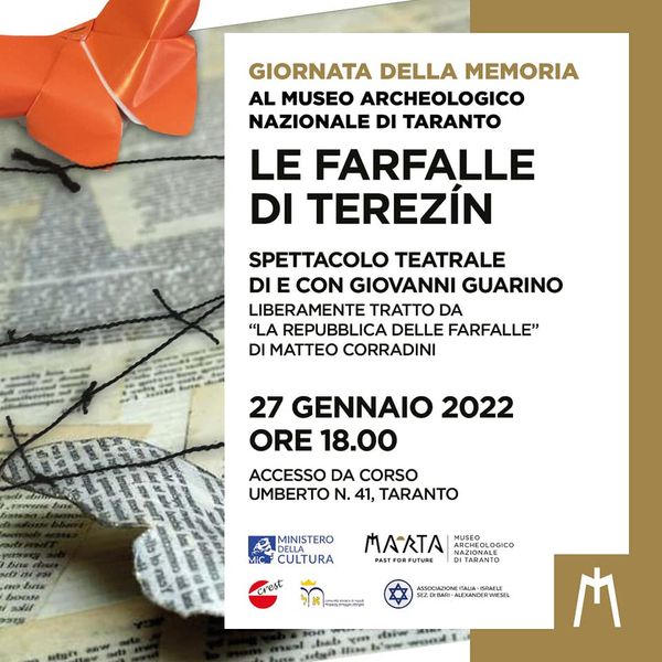 Le farfalle non vivono nel ghetto e il piccolo Pavel, imprigionato nel campo di sterminio di Terezín, lo sa.A lui e alle sue farfalle è dedicata la Giornata della Memoria celebrata al Museo Archeologico Nazionale di Taranto in ricordo di tutte le vittime dell’Olocausto, il prossimo giovedì 27 gennaio. In collaborazione con l’Associazione Italia-Israele sezione di Bari “Alexander Wiesel”, sarà il teatro “CREST – Collettivo di ricerche espressive e sperimentazione teatrale” a portare in scena giovedì 27 gennaio alle ore 18:00, lo spettacolo teatrale “Le farfalle di Terezín”.All’interno della Sala Incontri del MArTA (capienza limitata per contenimento del virus Covid-19) troverà spazio, nella performance dell’attore Giovanni Guarino, il testo teatrale liberamente tratto da “La Repubblica delle farfalle” di Matteo Corradini: un inno alla vita contro gli orrori del nazismo di cui si resero protagonisti i ragazzi del ghetto di Terezín che anche in mezzo a tutta quella violenza seppero dar vita ai loro sogni nel giornalino clandestino del Vedem (Avanguardia).“E’ la Memoria che si fa materia e risorge in un luogo di memoria per antonomasia, un Museo – dice la direttrice del MArTA, Eva Degl’Innocenti –anche quest’anno apriamo il MArTA alle testimonianze provenienti da una delle pagine più drammatiche del ‘900, riflettendo e costruendo insieme, come è nella natura stessa di chi serba la Memoria e ne fa Futuro”. Lo spettacolo teatrale del Crest, infatti, sarà preceduto dall’introduzione a cura dell’Associazione Italia-Israele sezione di Bari “Alexander Wiesel”.Allo spettacolo si potrà accedere soltanto con prenotazione obbligatoria e acquisto del biglietto-evento sulla piattaforma https://www.shopmuseomarta.it/it/ Con il biglietto, si potrà visitare il Museo Archeologico Nazionale di Taranto con un ingresso nel periodo tra il 28 gennaio ed il 4 febbraio, inserendo il codice del coupon che verrà trasmesso con la ricevuta di acqusto. Per informazioni info@shopmuseomarta.it Sito web www.museotaranto.beniculturali.it