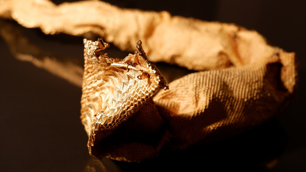 “L’ispirazione è indubbiamente arrivata dai celebri Ori di Taranto, ma il concetto è molto lontano da quei reperti – ammette Ferico Gori, di fronte alla teca dell’opera posizionata al terzo piano del MArTA – perché qui il riferimento è specificatamente al periodo aureo di ispirazione greca. Il periodo che dopo guerre e pandemie preannuncia un rinascita”