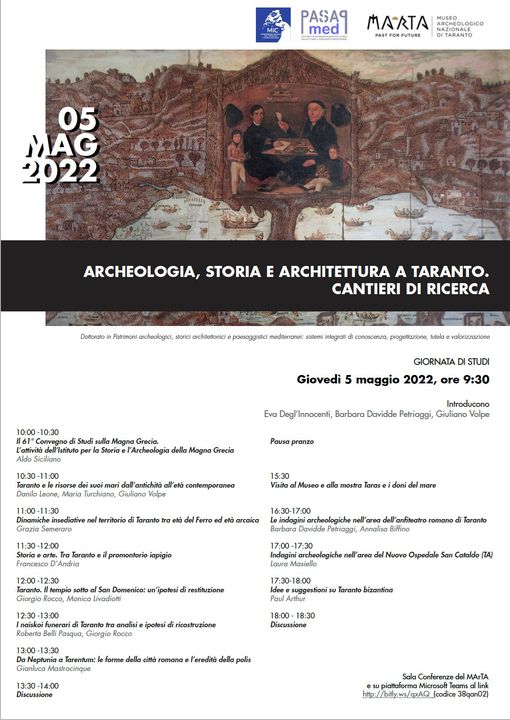 Giovedì 5 maggio 2022, nella sala Incontri del Museo Archeologico Nazionale di Taranto – MArTA, si terrà la Giornata di Studi “Archeologia, storia e architettura a Taranto. Cantieri di ricerca”, accessibile in presenza ai soli relatori e agli studenti del Dottorato in “Patrimoni archeologici, storici architettonici e paesaggistici mediterranei: sistemi integrati di conoscenza, progettazione, tutela e valorizzazione”. Il pubblico potrà seguire la giornata di studi unicamente in streaming sulla piattaforma Teams al link http://bitly.ws/qxAQ (codice 38qan02).