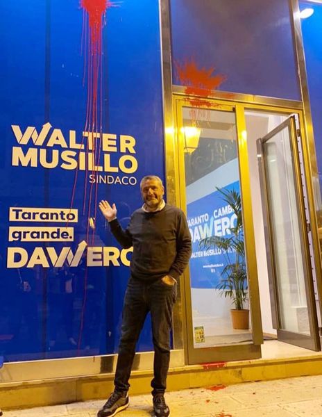 I due principali candidati a ricoprire la carica di Sindaco nelle prossime elezioni amministrative a Taranto hanno scelto di allestire le sedi dei propri comitati elettorali nella centrale Via Di Palma, nel Borgo Umbertino. I due quasi si fronteggiano, l’uno sul lato pari, l’altro sul lato dispari. Non sappiamo se in base ad una precisa scelta, o se solo per caso, i due locali commerciali vuoti da un pezzo per la crisi nel settore, che qui a Taranto si registra purtroppo anche in pieno centro cittadino, differiscono sensibilmente dal punto di vista tipologico. Quello di Musillo è aperto direttamente sulla strada con una struttura che si sviluppa in asse con la porta a vetri d’ingresso, consentendo anche dall’esterno la vista del grande tavolo collocato sul fondo, presieduto dal candidato. Ciò consente di riconoscere la presenza dell’aspirante Sindaco anche solo gettando uno sguardo fugace dalla via del passeggio (è tutta area pedonale) e, volendo, seguirne i dibattiti pur non rientrando nella schiera dei fedelissimi seduti sulle due file di sedie che occupano tutto lo spazio interno.