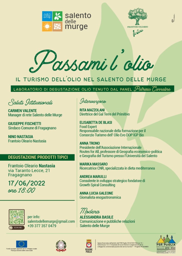 Venerdì 17 giugno 2022, alle ore 18, presso il Frantoio Oleario Nastasia, via Taranto Lecce 21, a Fragagnano, si terrà il primo di una serie di eventi promossi da Salento delle Murge, per la valorizzazione delle tipicità e delle eccellenze enogastronomiche del territorio. “Passami l’olio” propone un interessante confronto sul tema del turismo dell’olio, puntando sulla varietà degli interventi dei relatori esperti di diversi settori. L’apertura dell’incontro vedrà i saluti istituzionali di Giuseppe Fischetti sindaco Comune Fragagnano, di Carmen Valente, manager di rete Salento delle Murge e di Nino Nastasia, titolare del Frantoio oleario “Nastasia”. Alessandra Basile, referente per la comunicazione della rete “Salento delle Murge”, coordinerà gli interventi dei relatori: Rita Mazzolani, direttrice del Gal Terre del Primitivo; Elisabetta De Blasi, foodexpert e responsabile nazionale della formazione per il Consorzio Turismo dell’Olio Evo DOP IGP Bio; Anna Trono, presidente dell’Associazione Internazionale Routes for All e docente presso l’Università del Salento; Marika Massaro, ricercatrice CNR, specializzata in dieta mediterranea; Anna Lucia Galeone giornalista enogastronomica; Andrea Marulli, consulente in sviluppo strategico, fondatore di Growth Spiral Consulting.