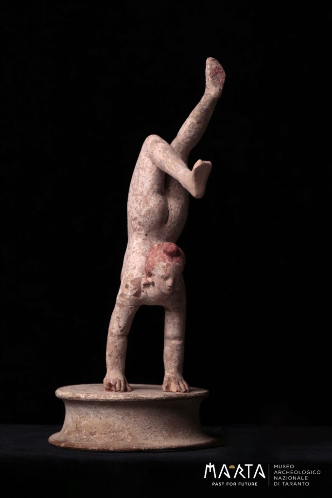 La rappresentazione dell’acrobata era molto diffusa dalla fine del periodo classico fino al periodo romano nel bacino del Mediterraneo: questi manufatti fotografano la ricercatezza nei costumi di quelle civiltà.