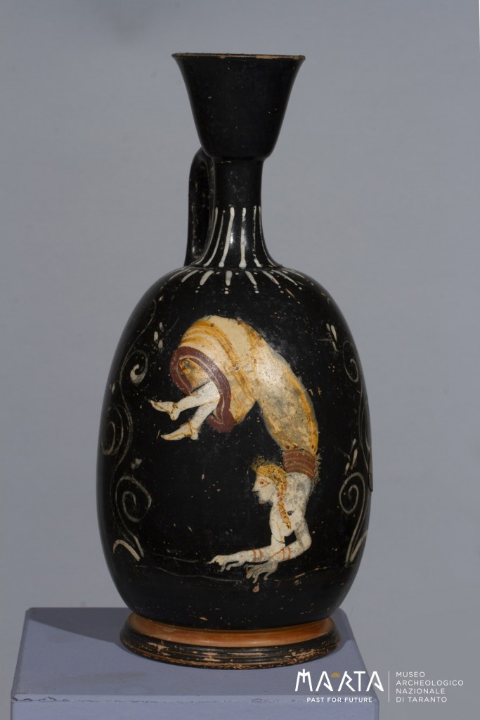 Si tratta infatti di capolavori dell’arte magno greca con un denominatore comune: l’eleganza e il virtuosismo delle figure femminili raffigurate, tra cui un’acrobata dipinta su un antico vaso utilizzato in età ellenistica per la conservazione di oli profumati e unguenti.