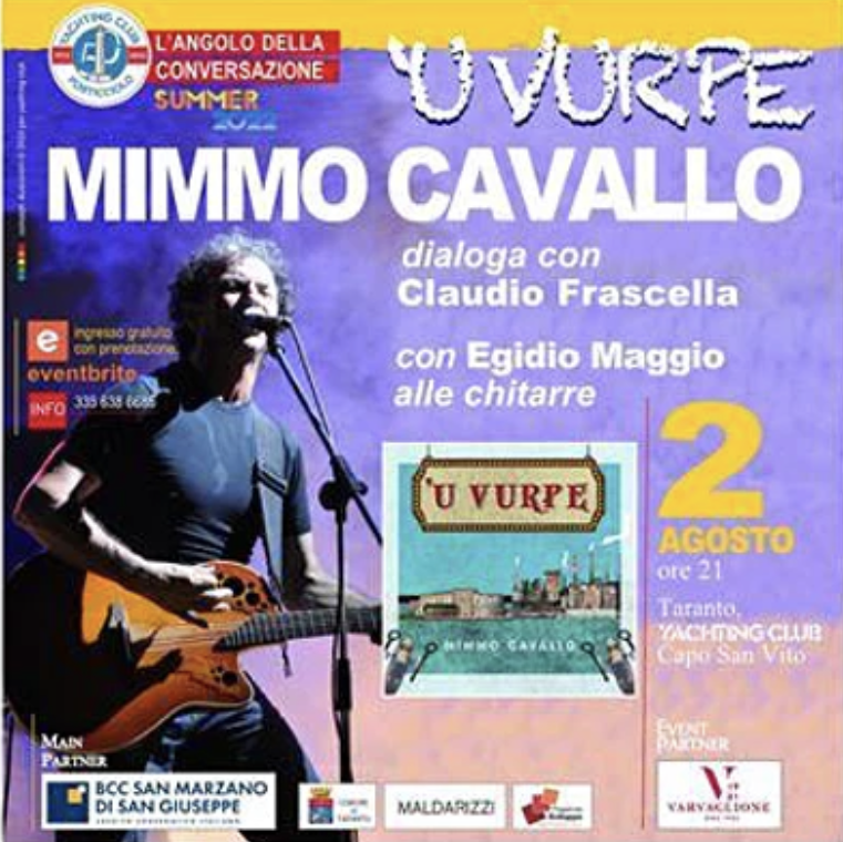 Mimmo Cavallo e Giancarlo De Cataldo saranno ospiti allo Yachting Club nei prossimi appuntamenti de L’Angolo della Conversazione. Martedì 2 agosto (ore 21:00), il cantautore tarantino, sul palco della Y beach, presenterà “ ‘U Vurpe” (Suoni dall’Italia/Believe), l’ultimo interessante singolo che segna il suo ritorno sulla scena discografica italiana. Il brano si può ascoltare in radio già dallo scorso 14 giugno e anticipa l’uscita del nuovo album. “ ‘U Vurpe” gioca sull’antropomorfismo uomini-pesci (branzini, boghe, sgombro, polpo etc.) tutti appartenenti al popolo del mare. Mare da dove proveniamo e dove, volenti o nolenti, siamo destinati a tornare. Mare come grembo identitario, gemma luccicante di vite perse e disperse. È la voce del popolo nel suo idioma più vero, biografie di personaggi fuori dal coro: gli ultimi (le “vope” della classe “voperaia” con le loro tute blu), il lupo branzino (una certa politica che ha dissanguato la città), il naccariedde roker (sgombro in concerto), il caurro (granchio) filosofo innamorato e non ricambiato dalla sogliola… e su tutti u’ vurpe (il polpo) metafora di una Taranto talattica protetta dal suo patrono (San Cataldo), una città dai numerosi volti, memore di un’antica civiltà mai dispersa che tanto agogna un riscatto. Sono ancora tutte queste vite traboccanti di birra (Raffo) incistata nelle mani dei tarantini. È la vita, infine, di Nicola, operaio ex Ilva, che si è dovuto arrendere al vento (il suo destino) che un giorno se l’è portato via. Taranto: tutto questo immaginario non si è mai spento e mai si spegnerà. Il brano è accompagnato da un video realizzato da Valentina Calvani e Fabiana Iacolucci.