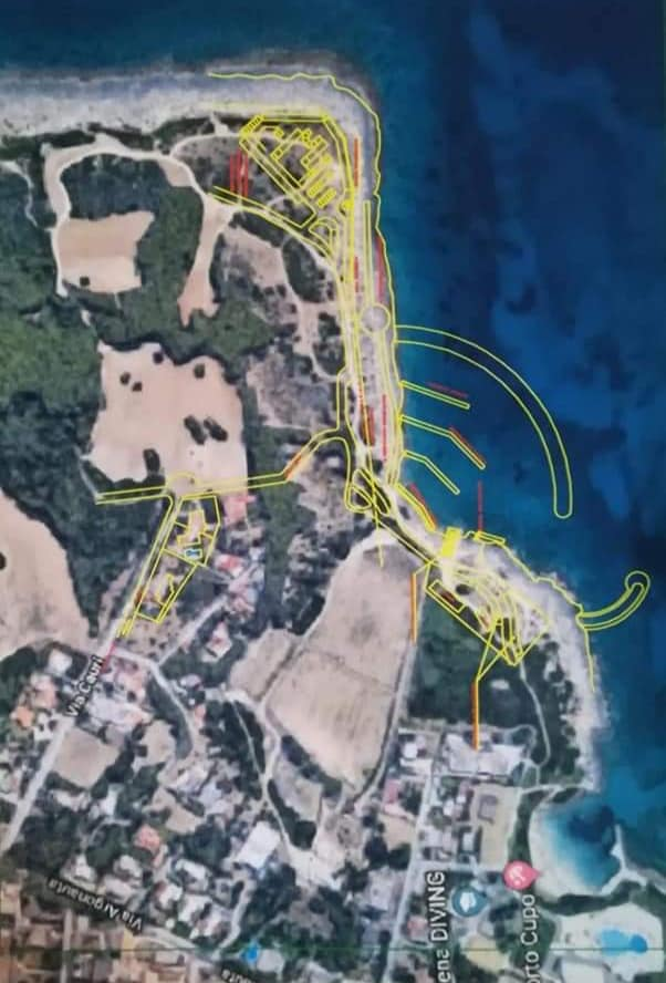 progettazione prima, e realizzazione, adesso, la costruzione di porticciolo turistico (oltre 200 posti barca) a nome della soc. Italconsult degli eredi del noto ing. Fasano (anche se dietro si mormora la presenza di ben altri soggetti). In definitiva, in assenza persino di un Piano delle coste approvato dal Consiglio comunale di Taranto, si sta distruggendo la scogliera con rara macchia mediterranea e diradando metà del bosco di pini D’Aleppo, unico sulla costa tarantina (per fortuna l’altra metà appartiene a Leporano – detta Batteria Cattaneo). Senza contare appunto, il disturbo arrecato alla fauna selvatica, anche quella sui fondali. Last but not least, diverse famiglie che approfittavano di una comoda discesa in un mare turchese, non potranno più usufruirne.