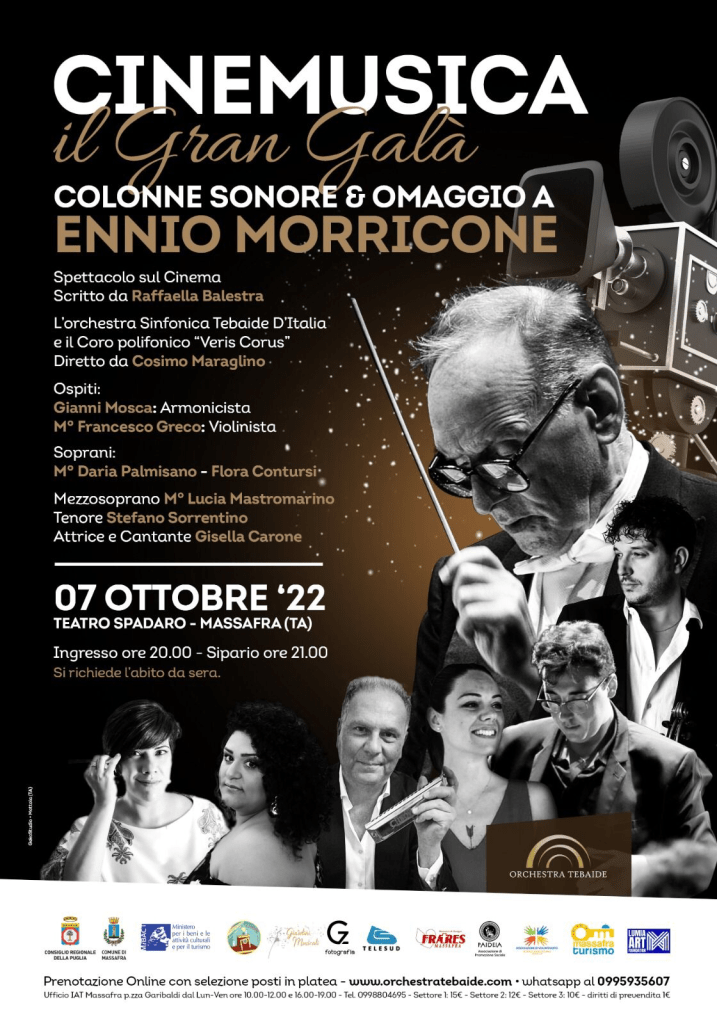 Venerdì 7 ottobre, alle 21.15, al teatro Spadaro di Massafra (Ta), si terrà lo spettacolo “Cinemusica il gran galà – colonne sonore & omaggio a Ennio Morricone” scritto da Raffaella Balestra ed eseguito dall’orchestra sinfonica Tebaide D’Italia accompagnata dal coro polifonico “Veris Corus”, 80 elementi in totale, diretti dal maestro Cosimo Maraglino e con la partecipazioni di numerosi ospiti.