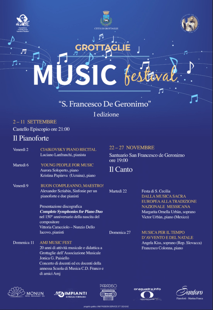 Si chiude con la serata di domenica 11 settembre quindi la prima parte del Music Festival San Francesco De Geronimo, quella che ha avuto come bellissima cornice il Castello Episcopio e che ha puntato sull’espressione musicale del pianoforte. La seconda parte conta altri due appuntamenti, previsti per il 22 ed il 27 novembre, presso il Santuario San Francesco De Geronimo con inizio alle 19.00. Gli eventi musicali di chiusura si terranno in un perfetto clima prenatalizio e avranno il canto come protagonista.