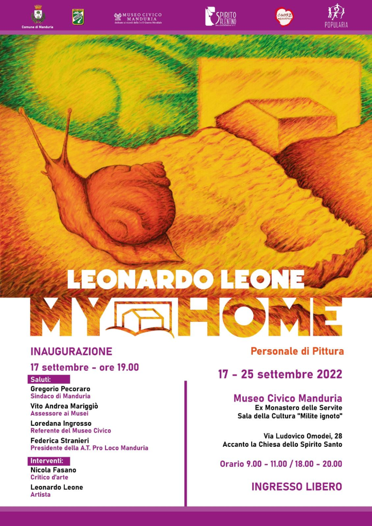 Dopo la recente mostra di pittura (svoltasi a luglio), dal titolo “Fra poco tutto cambierà”, l’artista manduriano Leonardo Leone propone una nuova mostra personale, dal titolo “MY HOME”, dal 17 al 25 settembre, presso il Museo Civico di Manduria (ex Monastero delle Servite). L’evento è patrocinato dal Comune di Manduria, in collaborazione con Pro Loco Manduria, Museo Civico di Manduria, Cooperativa “Spirito Salentino”, gruppo “Cuore Messapico”, con il contributo di Popularia OdV per la comunicazione.