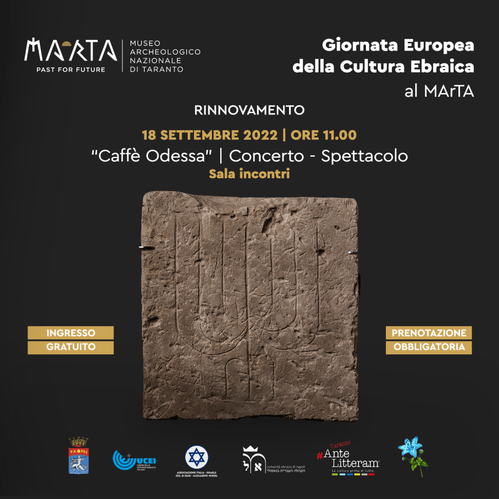 Il 18 settembre alle ore 11.00, il MArTA ospiterà un evento patrocinato dall’UCEI (Unione delle Comunità Ebraiche Italiane), dalla Comunità Ebraica di Napoli, dall’Associazione Culturale Italia-Israele « Alexander Wiesel » di Bari e dall’Associazione Ante Litteram di Taranto.
