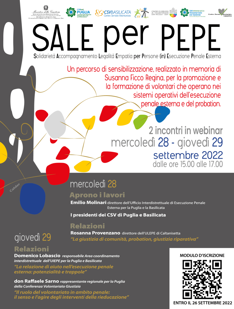 Un percorso di sensibilizzazione, promozione e formazione per i volontari che operano nei sistemi operativi dell’esecuzione penale esterna e del probation. È questo l’obiettivo della due giorni di formazione on line organizzata dall’Ufficio Interdistrettuale di Esecuzione Penale Esterna per la Puglia e Basilicata – Dipartimento per la Giustizia Minorile e di Comunità del Ministero della Giustizia, in collaborazione con i Centri di Servizio al Volontariato delle due regioni, nell’ambito del Progetto “SALE per PEPE”.