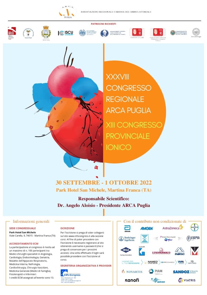 I lavori si terranno nelle sale del Park Hotel San Michele di Martina Franca (venerdì 30 settembre dalle ore 9 alle 18 e sabato 1 ottobre delle ore 9 alle 13). Saranno presenti circa 70 relatori e moderatori, tra i rappresentanti di maggior prestigio della cardiologia pugliese e nazionale. Tra tutti, il presidente nazionale Arca, dott. Giovanni Zito; il professore Paolo Rizzon, presidente onorario del congresso e fondatore della cardiologia pugliese; e i professori: Pasquale Perrone Filardi, presidente eletto nazionale della Sic, società italiana di cardiologia; Marco Ciccone, direttore della scuola di specializzazione in Cardiologia dell’Università di Bari e Natale Brunetti, direttore della scuola di specializzazione in Cardiologia dell’Università di Foggia.