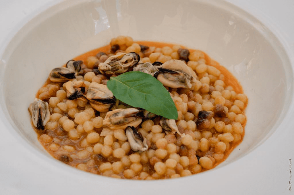 Nell’ambito della manifestazione enogastronomica Ego Festival, Cozza e Granchio blu, un connubio ideale, sono diventati un piatto unico grazie al lavoro del cuoco tarantino Agostino Bartoli, resident chef de “Al Gatto Rosso”, e di quello Tunisino Mounir El Arem, executive del ristorante “Le Baroque” a Tunisi e da ben otto anni membro attivo della National Academy of Cuisine France. Il risultato del loro lavoro a quattro mani è stata una fregola sarda con bisque di Granchio blu rimasta sul fuoco 8 ore e costantemente raffreddata, con una cozza aperta sul fuoco con la sua acqua, e adagiata sulla pasta per rilasciare tutto il suo sapore umami.
