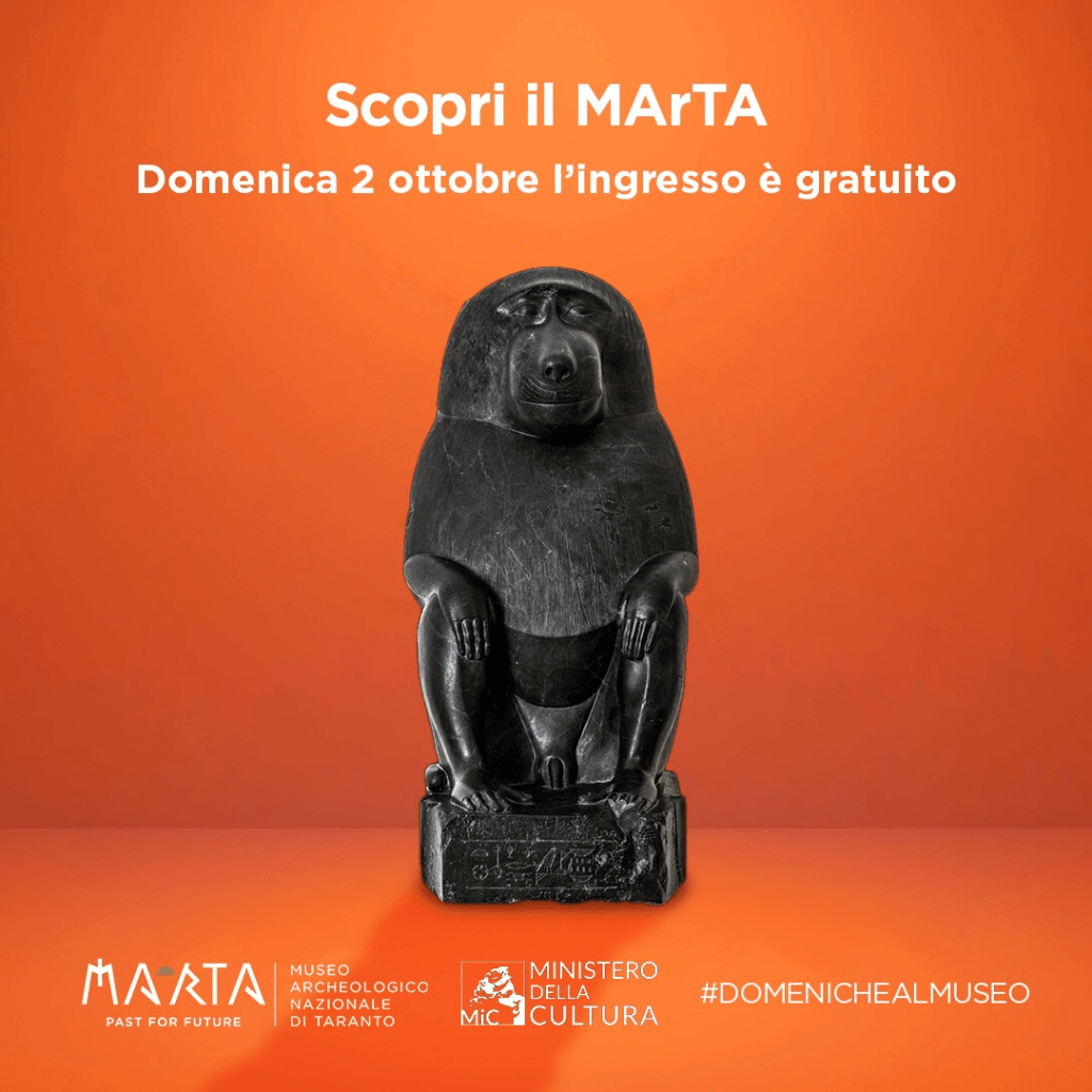 E’ la statua in basalto del dio egizio della scrittura Thot, il reperto testimonial scelto dal Museo Archeologico Nazionale di Taranto, per ricordare la gratuità dell’ingresso al MArTA nella prima domenica del mese.