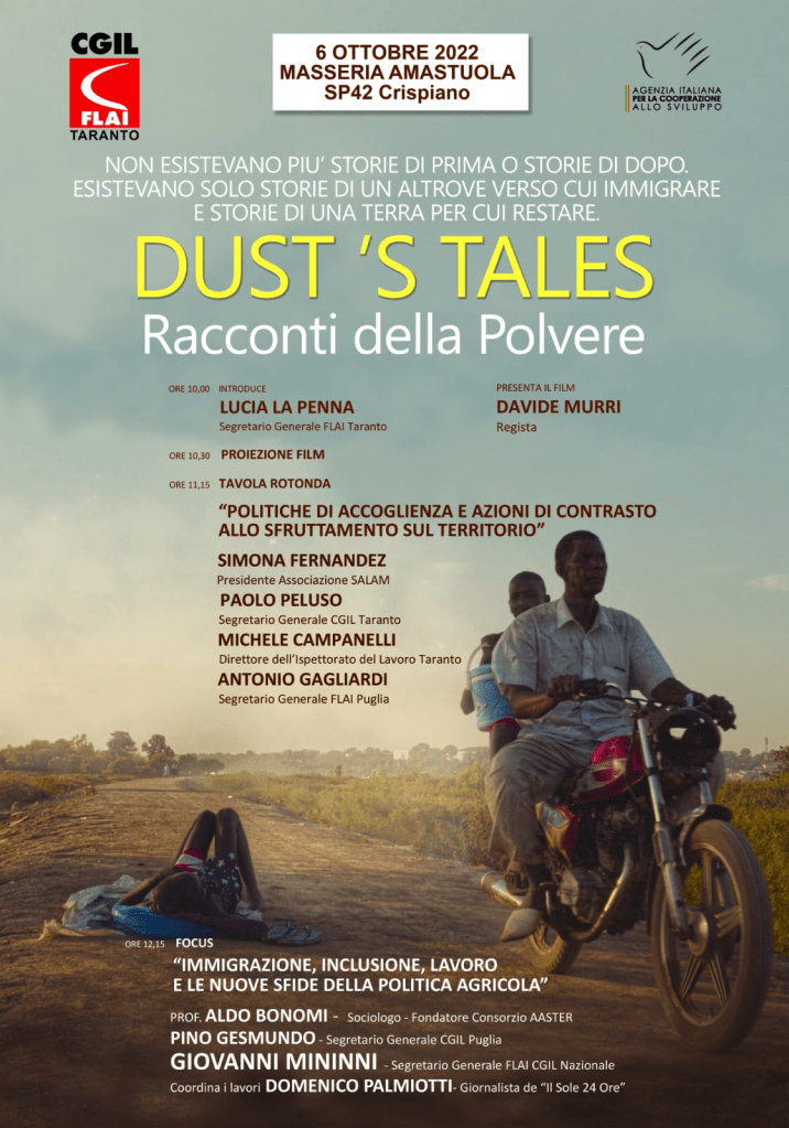 Una giornata di confronto, dibattito e approfondimento che sarà aperta dalla proiezione del docufilm “Dust’s Tales. I racconti della polvere” del regista Davide Murri che presenterà la sua opera. Voci, volti, testimonianze sulle due sponde del Mediterraneo: da una parte l’Africa carica di speranze, dall’altra l’Italia che accoglie a metà. Dall’inferno dei campi della Libia, alla vergogna del ghetto di Borgo Mezzanone.