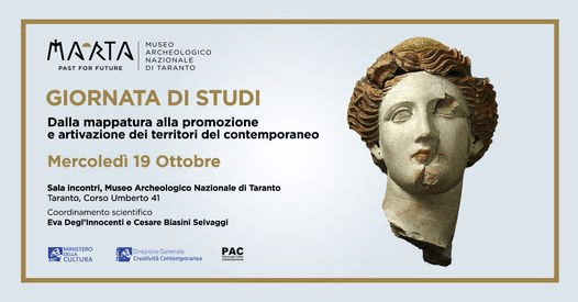 Si svolgerà mercoledì 19 ottobre a partire dalle ore 11.00, presso la Sala Incontri del Museo Archeologico Nazionale di Taranto – MArTA (ingresso da Corso Umberto n. 41), la Giornata di Studi intitolata Dalla mappatura alla promozione e artivazione dei territori del contemporaneo, con il coordinamento scientifico di Eva Degl’Innocenti (Direttrice del Museo Archeologico Nazionale di Taranto) e Cesare Biasini Selvaggi (Manager culturale e direttore editoriale di Exibart), a cui interverranno rappresentanti di importanti istituzioni nazionali: Ministero della Cultura, Ministero degli Affari Esteri e della Cooperazione Internazionale, La Quadriennale di Roma, Fondazione Pistoletto-Cittadellarte. La Giornata di Studi si svolgerà in presenza, ma sarà anche fruibile in diretta sui profili Facebook, LinkedIn e YouTube del Museo Archeologico Nazionale di Taranto.