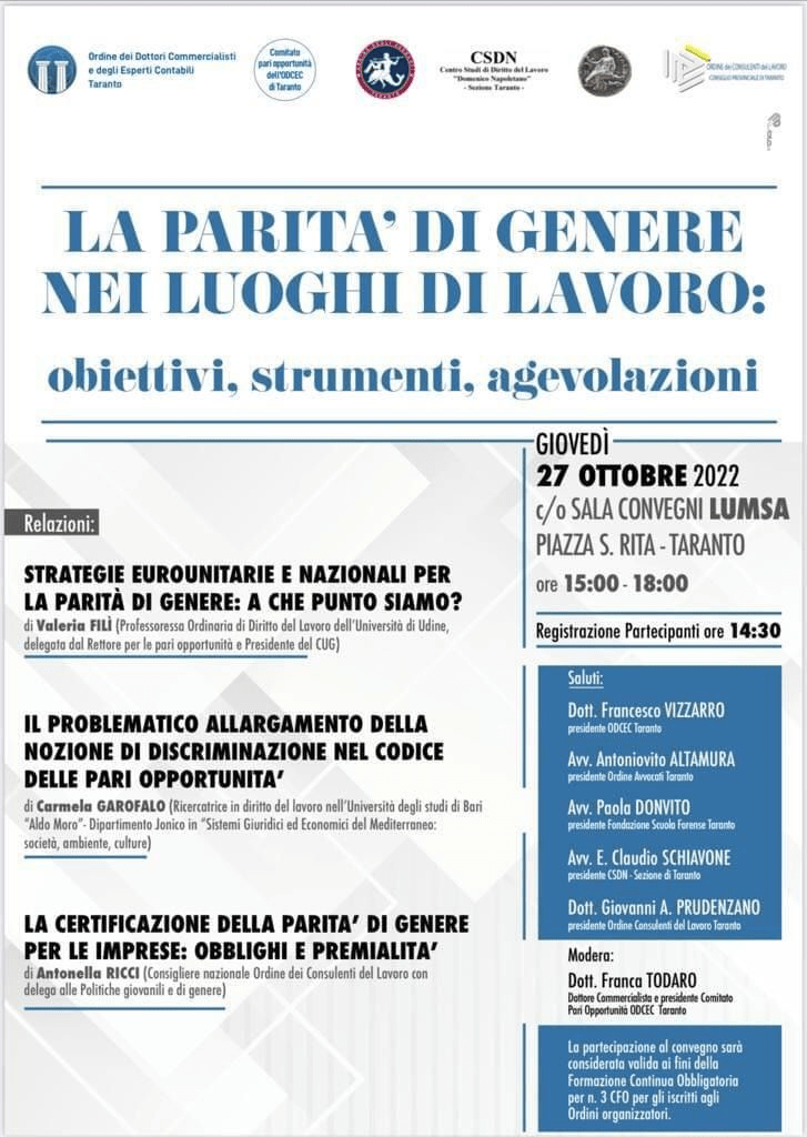 Il Comitato delle Pari Opportunità dell’ODCEC di Taranto in collaborazione con l’Ordine degli Avvocati di Taranto, con la Fondazione Scuola Forense Taranto, con il Centro Studi di Diritto del Lavoro “ Domenico Napoletano ”-sez. di Taranto e con l’Ordine dei Consulenti del lavoro, ha promosso per giovedì 27 ottobre 2022 l’evento: “La parità di genere nei luoghi di lavoro: obiettivi, strumenti, agevolazioni”.