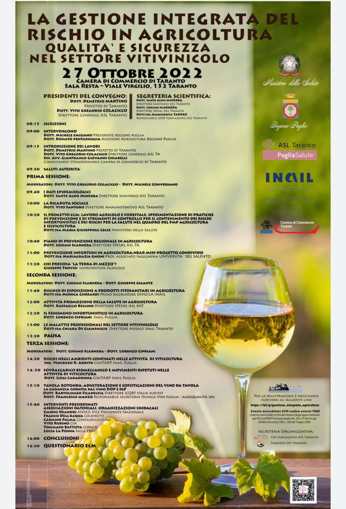 Nel nostro territorio inoltre, il comparto agricolo è caratterizzato da una notevole estensione di vigneti e da numerose cantine vinicole. Data l’importanza dell’argomento, il 27 ottobre, si terrà a Taranto, nella sala Resta della Camera di Commercio il convegno “La gestione integrata del rischio in agricoltura. Qualità e sicurezza del settore vitivinicolo”.