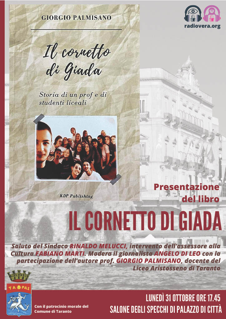 Lunedì 31 Ottobre alle ore 17.45, nel Sala degli Specchi di Palazzo di Città di Taranto, si svolgerà la presentazione del libro “Il Cornetto di Giada”. E’ previsto il saluto del Sindaco Rinaldo Melucci, l’intervento dell’assessore alla Cultura Fabiano Marti e della Dott.ssa Rita Frunzio, dirigente scolastico del Liceo Ginnasio Aristosseno di Taranto.