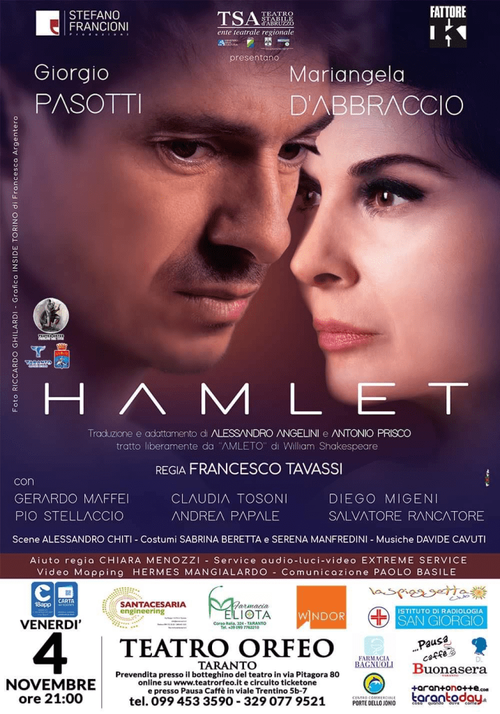Giorgio Pasotti e Mariangela D’Abbraccio, due attori amatissimi dal pubblico, saranno protagonisti al Teatro Orfeo di Taranto con Hamlet per la regia di Francesco Tavassi. Hamlet, di Alessandro Angelini e Antonio Prisco, è liberamente tratto dalla grandiosa opera di William Shakespeare; prodotto dal TSA Teatro Stabile d’Abruzzo, Stefano Francioni Produzioni, Fattore K e distribuito da Mariangela De Riccardis.