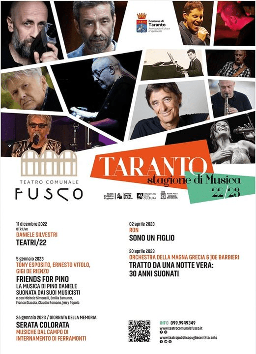 «Si tratta di appuntamenti con le tante sfumature della canzone italiana – le parole dell’assessore Marti –, e che attraverso generi diversi vogliono affermare le peculiarità dei cantautori nostrani. L’orgoglio sta naturalmente nell’ospitare all’interno di una struttura tutta tarantina come il Teatro comunale Fusco questi concerti in cui vedremo il meglio del panorama canoro nazionale. Taranto si conferma un centro importante per la musica, in cui non solo attrarre i grandi artisti di fama nazionale e internazionale, ma anche valorizzare i giovani cantanti del territorio, come abbiamo dimostrato con il bando Emergenze Musicali».