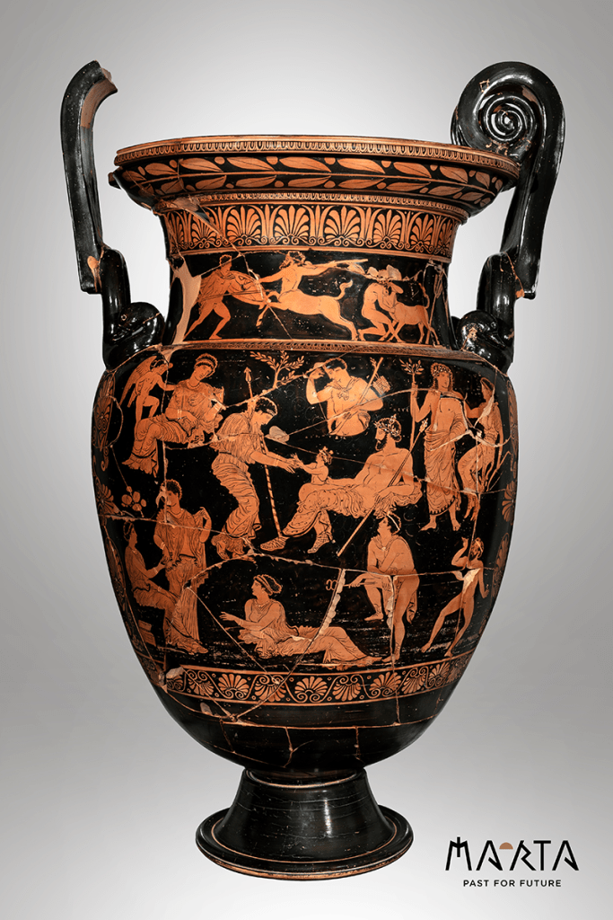 Tre allegorie della Divina commedia di Dante e sullo sfondo il cratere a volute protoapulo a figure rosse (400 – 380 a.C.) raffigurante la nascita di Dioniso.