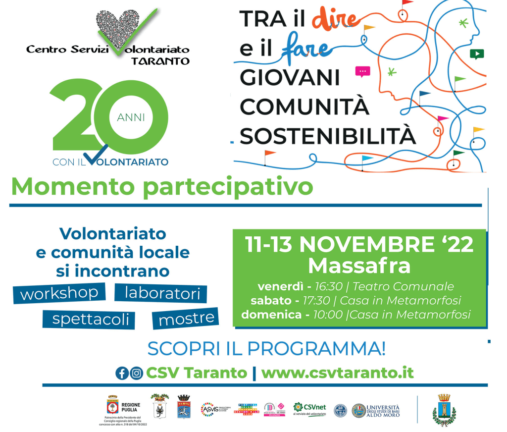 Il primo Momento partecipativo, che vede la collaborazione dell’Amministrazione Comunale, si terrà da venerdì 11 a domenica 13 novembre a Massafra, città caratterizzata da un tessuto associativo molto ricco e vivace.