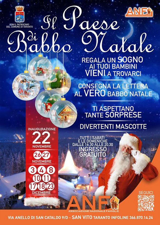 Torna il Paese di Babbo Natale dell’ANF, Associazione Nazionale Famiglie di Taranto, l’iniziativa solidale, ludica, artistica e sociale rivolta ai bambini, che sarà inaugurata – con ingresso libero e gratuito – alle ore 16.30 di martedì 22 novembre, Santa Cecilia, presso la sede dell’associazione, in via Anello di San Cataldo 9/D a San Vito.