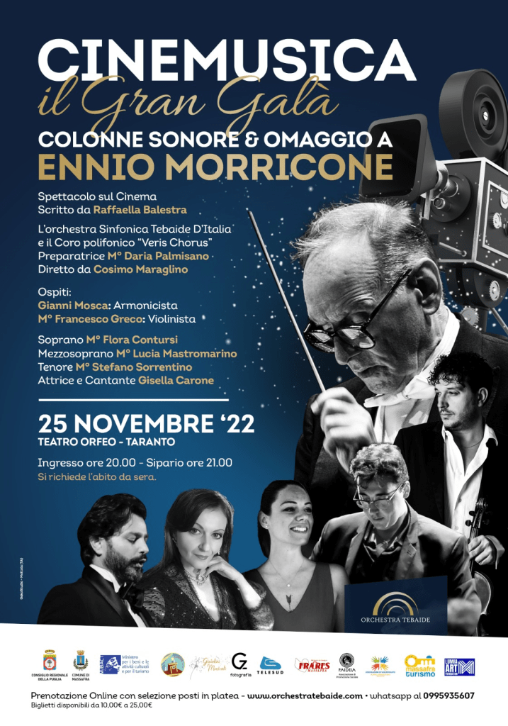 Venerdì 25 novembre, alle 21.00, al teatro Orfeo di Taranto, si terrà lo spettacolo “Cinemusica il Gran Galà – colonne sonore & omaggio a Ennio Morricone” scritto da Raffaella Balestra ed eseguito dall’orchestra sinfonica Tebaide D’Italia accompagnata dal coro polifonico “Veris Chorus”, 80 elementi in totale, diretti dal maestro Cosimo Maraglino e con la partecipazioni di numerosi ospiti.