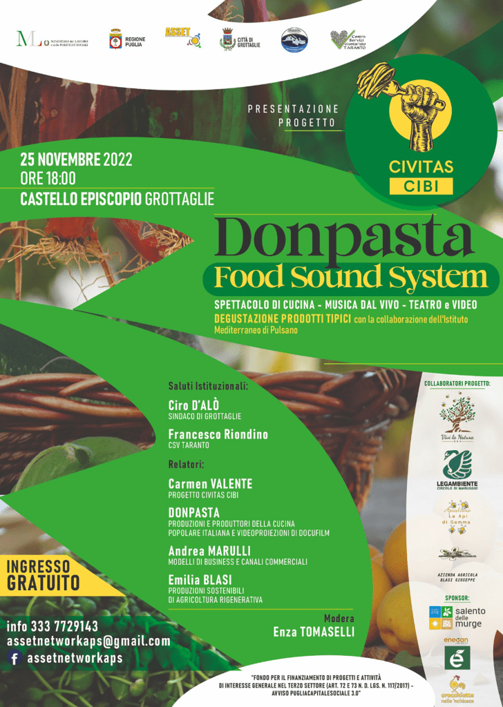 Sarà Donpasta il protagonista del grande evento pubblico “Civitas cibi” che, organizzato da Asset Network Aps, si terrà, con ingresso libero a gratuito, al Castello Episcopio Grottaglie alle ore 18.00 di venerdì 25 novembre (info 333.7729143 – assetnetworkaps@gmail.com); al termine è prevista la degustazione di prodotti tipici.
