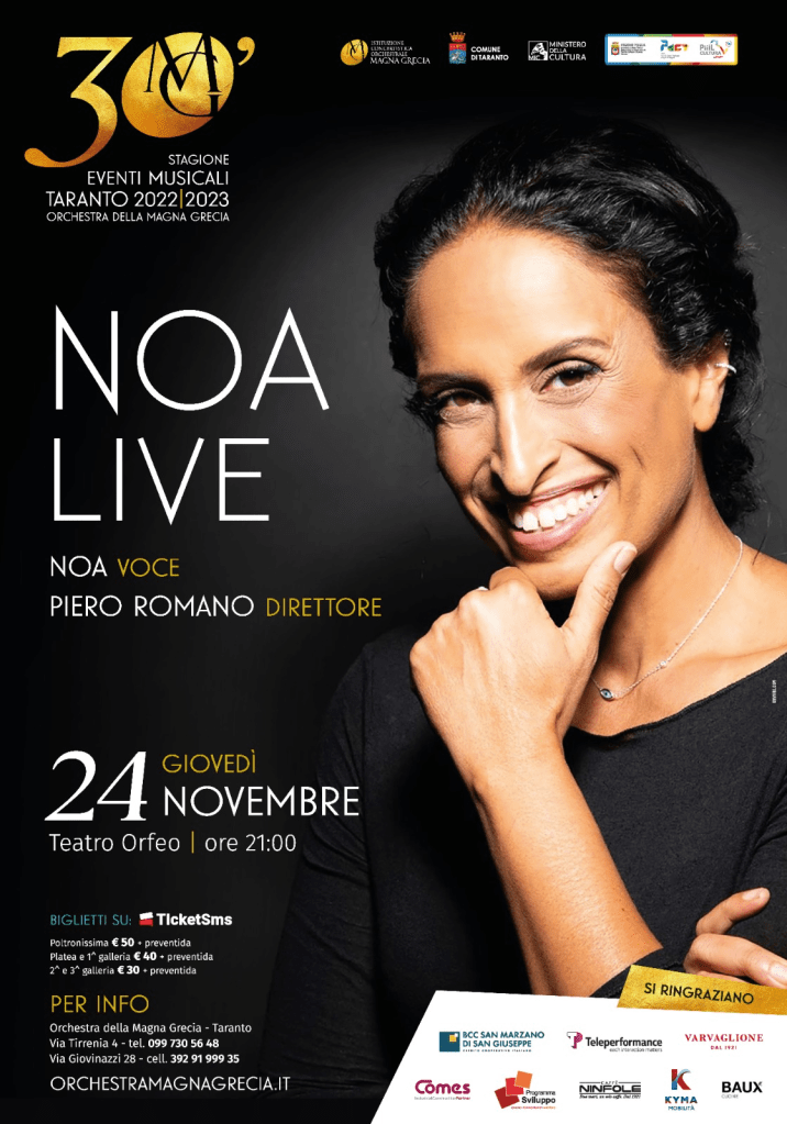 Giovedì 24 novembre alle 21.00 al Teatro Orfeo di Taranto, nuovo appuntamento con la Stagione Eventi musicali 2022/2023. In programma l’attesissimo “Noa Live”, con l’Orchestra della Magna Grecia diretta dal Maestro Piero Romano, direttore artistico della rassegna musicale che celebra i trent’anni dell’ICO tarantina. Noa torna ad esibirsi a Taranto, dopo qualche anno. Un ritorno a grande richiesta, come quello di altri artisti che hanno partecipato all’affermazione di una serie di appuntamenti che negli anni hanno contribuito ad affermare ad alti livelli l’attività orchestrale che, nel tempo, ha saputo declinarsi oltre che con lirica e opere, anche con rock e pop.
