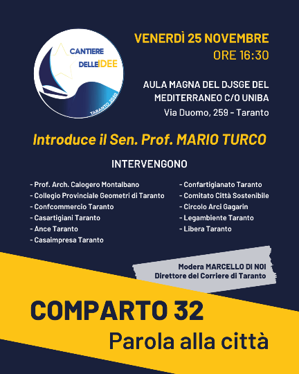 Venerdì 25 novembre 2022 alle ore 16:30, presso l’Aula Magna del Dipartimento Jonico in Sistemi Giuridici ed Economici del Mediterraneo (Università degli Studi di Bari “Aldo Moro”, Via Duomo, 259, Taranto) sì terrà l’evento “Comparto 32 – Parola alla città” promosso dall’associazione “Il Cantiere delle Idee”.