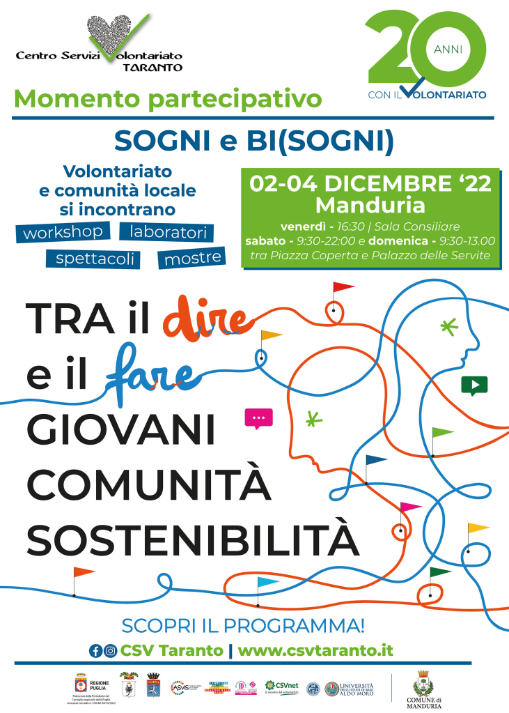 Il Momento partecipativo di Manduria si terrà, in collaborazione con la locale Amministrazione Comunale, da venerdì 2 a domenica 4 dicembre, coinvolgendo l’area orientale del territorio provinciale; tutte le iniziative sono con ingresso libero e gratuito (programma www.csvtaranto.it).