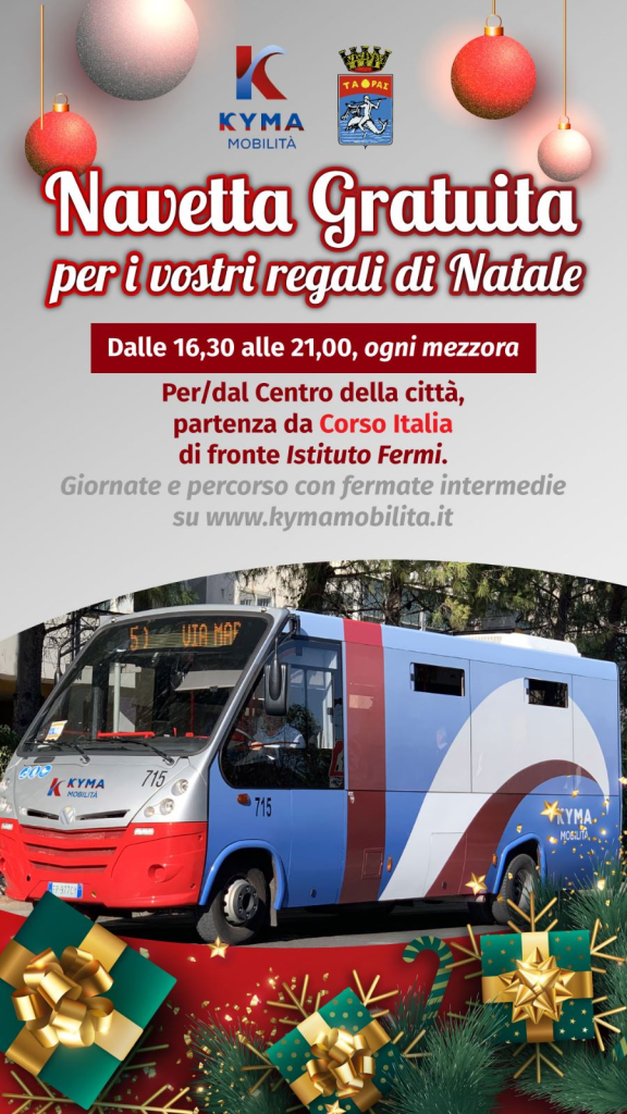 Annunciando l’avvio del servizio il Presidente di Kyma Mobilità Alfredo Spalluto ha commentato: «è un modo veloce e comodo per raggiungere le vie dello shopping natalizio del centro di Taranto, senza impazzire nel traffico per ore e ore cercando un parcheggio, ma spostandosi velocemente nelle corsie preferenziali riservate agli autobus!»