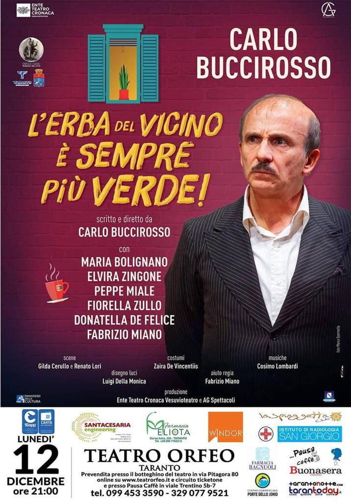 L’erba del vicino è sempre più verde? A questo eterno interrogativo risponde lo spettacolo di Carlo Buccirosso, in scena lunedì 12 dicembre alle ore 21 al Teatro Orfeo di Taranto.