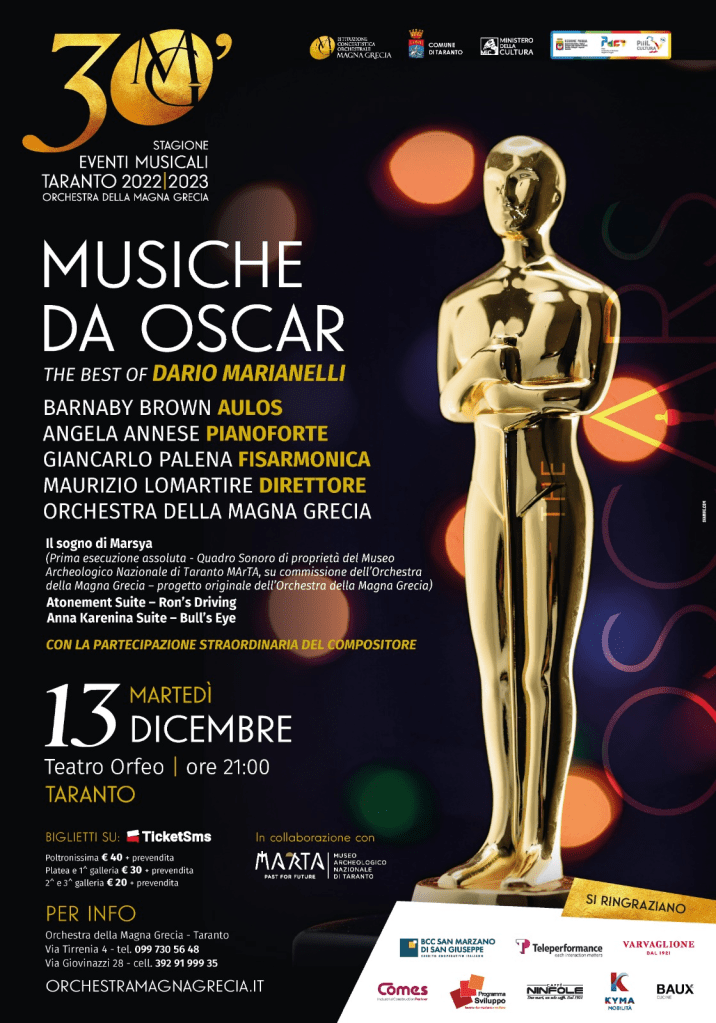 Proprio “Marsya’s dream” (Il sogno di Marsya), Quadro sonoro di proprietà del Museo archeologico di Taranto e commissionato dalla stessa Orchestra della Magna Grecia, sarà eseguito per la prima volta in assoluto alla presenza dello stesso Maestro Dario Marianelli, che lo scorso 25 giugno aveva incontrato la stampa nelle Sale del “MArTa” per annunciare questo suo straordinario impegno musicale.