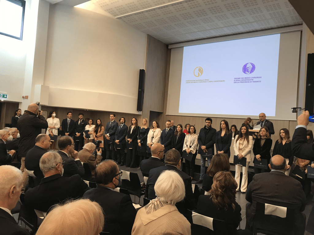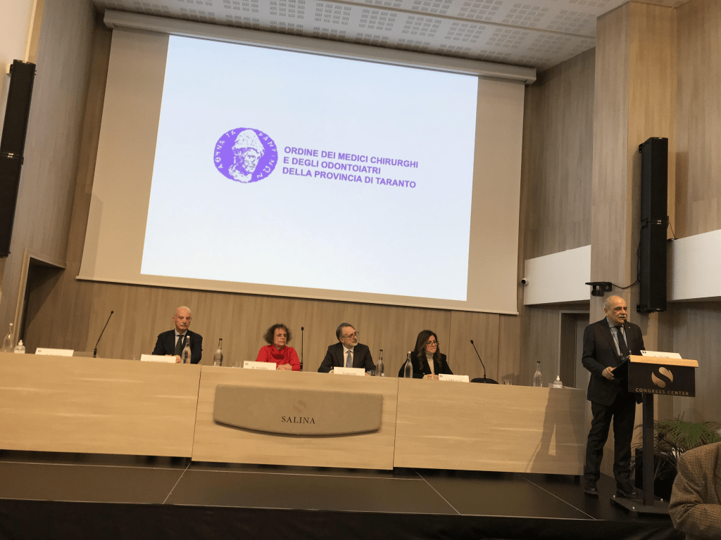 Medicina di genere, difesa del Servizio sanitario nazionale e nuove sfide. Sono stati questi i temi di cui si è parlato ieri mattina all’hotel Salina a Taranto, in occasione della cerimonia, organizzata dall’Ordine dei Medici Chirurghi e degli Odontoiatri della provincia di Taranto, per la consegna delle Medaglie d’Oro ai colleghi che quest’anno festeggiano cinquant’anni dalla laurea e per la proclamazione del Giuramento professionale che ha visto, invece, protagonisti i colleghi più giovani in un simbolico passaggio del testimone. Seduti al tavolo della presidenza, i dottori Cosimo Nume (presidente dell’Ordine), Marialetizia Marra (vice presidente), Salvatore Montorsi (segretario), Gaetano Grassi (tesoriere), Francesca Russo (presidente della Commissione Medici) e Ilaria Fricelli (vice presidente della Commissione Odontoiatri). Tra le autorità, il direttore generale dell’Asl Taranto Vito Gregorio Colacicco, il preside della Scuola di Medicina Alessandro Dell’Erba, il dottor Franco Lavalle (vice presidente OMCeO di Bari), il dottor Salvatore Mendicini (capitano di vascello della Marina Militare), il dottor Fiorenzo Fracasso (capitano di vascello della Marina Militare), Rinaldo Melucci (sindaco di Taranto), Vincenzo Damiano (sindaco di Leporano), Giovanni Basta (delegato sindaco di Martina Franca) e Gaetano Pichierri (sindaco del Comune di Sava).