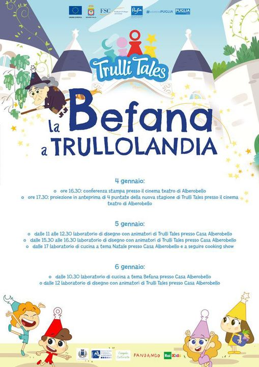 ‘La Befana a Trullolandia’ è l’evento tanto atteso dai più piccoli che porterà per tre giorni ad Alberobello – dal 4 al 6 gennaio prossimi – la magia di Trulli Tales con Ring Zip, Stella e Sun, i protagonisti della serie Tv ideata dalle sorelle Fiorella e Maria Elena Congedo, i quali accoglieranno i piccoli ospiti per vivere insieme tante meravigliose avventure.