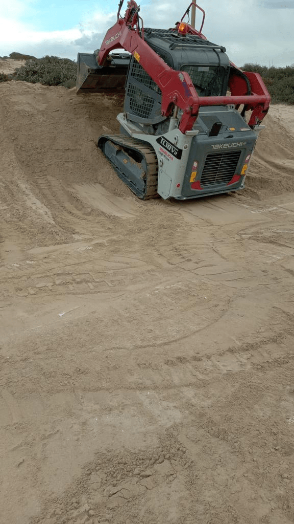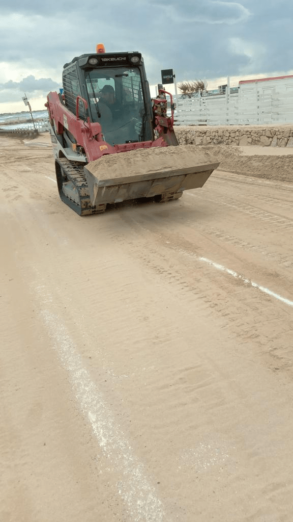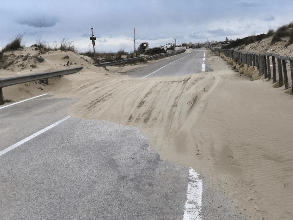 Mezzi al lavoro, lungo la litoranea che attraversa Marina di Taranto, per rimuovere la sabbia che ha invaso la sede stradale.