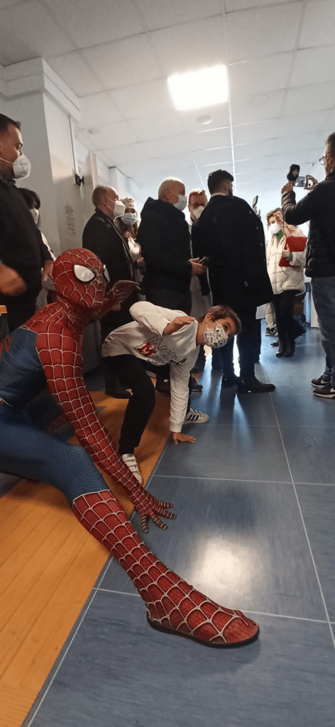 Spiderman, ospite speciale in corsia, al sesto piano del Santissima Annunziata.