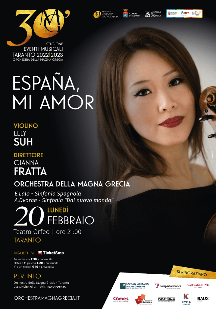 Lunedì 20 febbraio alle 21.00 al teatro Orfeo di Taranto, “España, mi amor”. Protagonista la violinista Elly Suh con l’Orchestra della Magna Grecia diretta da Gianna Fratta. E’ un altro dei concerti di grande richiamo della Stagione Eventi 2022-2023 con la direzione artistica del Maestro Piero Romano. Fra i brani in programma: “Sinfonia spagnola op. 21” per violino e orchestra del francese Edouard Lalo, e “Sinfonia n. 9 (“dal Nuovo Mondo”) op. 95” per orchestra del ceco Antonin Dvorak.