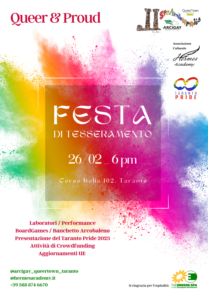 Per Domenica 26 Febbraio il Comitato Territoriale Arcigay Strambopoli QueerTown Taranto e la Hermes Academy, in collaborazione con il Coordinamento Taranto Pride e The Greens/EFA, organizzano Queer & Proud.