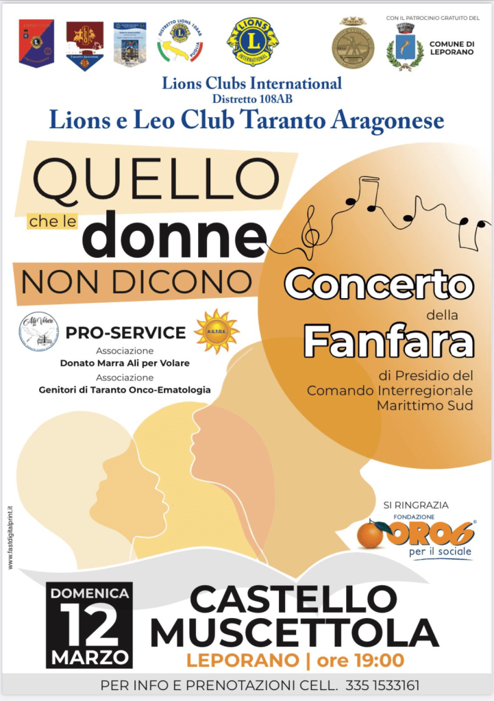 “Quello che le donne non dicono” è il concerto di beneficenza, che si terrà domenica 12, organizzato dal Lions Club Taranto Aragonese. La Fanfara del Presidio dipartimentale del Comando Marittimo si esibirà dalle 19.00.