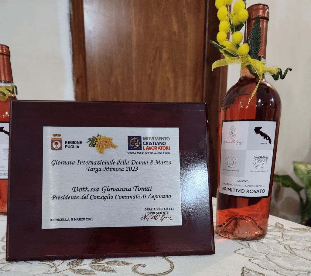 Domenica 5 marzo, al Presidente del Consiglio del Comune di Leporano Giovanna Tomai è stata consegnata la targa Mimosa 2023, in occasione della giornata dedicata alle donne. Il premio è stato conferito dalla presidente del MCL (Movimento Cristiano dei Lavoratori) circolo di Torricella Grazia Pignatelli e dall’onorevole Giovanni Maiorano, con la seguente motivazione: «A una donna forte e tenace che ha trovato il coraggio in sé stessa, perché crede nei valori di una politica trasparente come la sua personalità».