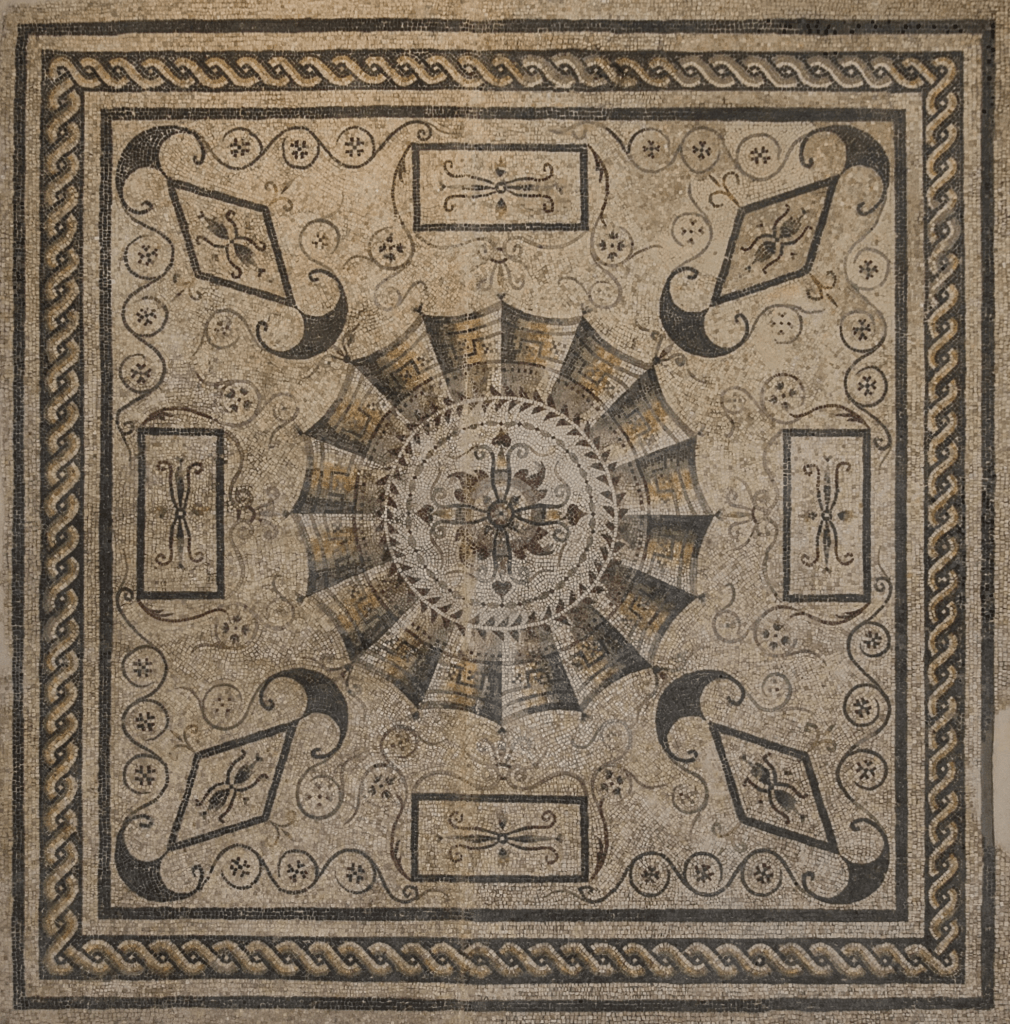 Il raffinato mosaico realizzato con piccole tessere quadrate è un forte richiamo al mondo dello spettacolo, infatti riporta al centro un motivo identificato proprio come un Velarium, ovvero la copertura di tela usata negli anfiteatri romani per proteggere dal sole gli spettatori.