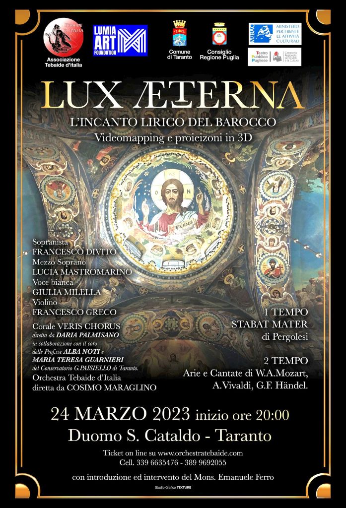 Venerdì 24 marzo nel Duomo S. Cataldo di Taranto, sarà proposto “Lux Aeterna – L’Incanto lirico del barocco Per orchestra, coro e solisti”, un suggestivo video mapping con accompagnamento musicale eseguito dall’orchestra Tebaide D’Italia diretta dal maestro Cosimo Maraglino e dal coro polifonico “Veris Chorus” di Daria Palmisano in collaborazione con il coro della prof.ssa Alba Noti e Maria Teresa Guarnieri del Conservatorio G. Paisiello di Taranto, con la partecipazione di vari solisti.