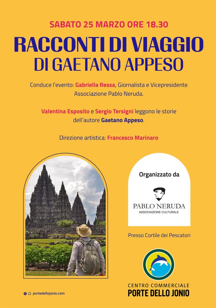 Continua il percorso di diffusione della lettura e della cultura dell’associazione “Pablo Neruda” che sabato 25 marzo 2023 presenterà il pluripremiato scrittore tarantino Gaetano Appeso, autore di libri che, nella forma di diari, raccontano i suoi viaggi estremi, fatti quasi sempre in solitudine, in Paesi lontanissimi e bellissimi. Sabato prossimo alle ore 18.30 nel Cortile del Pescatore presso Porte dello Jonio la giornalista Gabriella Ressa, vice Presidente di Neruda Associazione, dialogherà con lo scrittore. Ad organizzare l’incontro letterario l’Associazione “Pablo NERUDA” con il presidente Saverio Sinopoli d’intesa con il direttore del Centro, Mauro Tatulli.