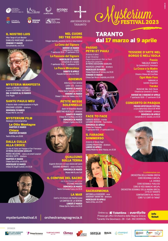Giunto alla nona edizione e in programma dallo scorso 17 marzo al 9 aprile, il Mysterium Festival 2023 è organizzato da Le Corti di Taras in collaborazione con Arcidiocesi di Taranto, Comune di Taranto, Orchestra della Magna Grecia, Chorus e ARCoPU; con il patrocinio di Ministero della Cultura e Regione Puglia e il sostegno di BCC San Marzano di San Giuseppe, Teleperformance, Varvaglione Vini, Comes, Programma Sviluppo, Caffè Ninfole, Baux Cucine e Chemipul.