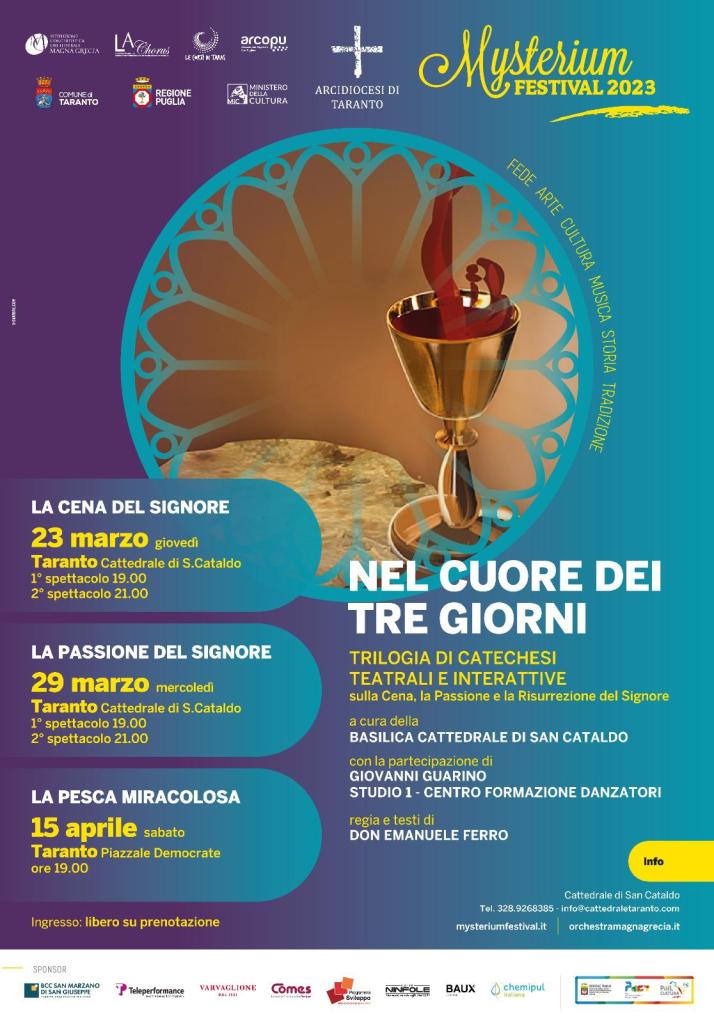 Nel cuore dei tre giorni, con temi diversi, sarà programmato giovedì 23 marzo nella Cattedrale di San Cataldo alle 19.00 e alle 21.00 (La cena del Signore); mercoledì 29 marzo nella Cattedrale di san Cataldo alle 19.00 e alle 21.00 (La Passione del Signore); sabato 15 aprile nel piazzale Democrate alle 19.00 (La Pesca miracolosa).